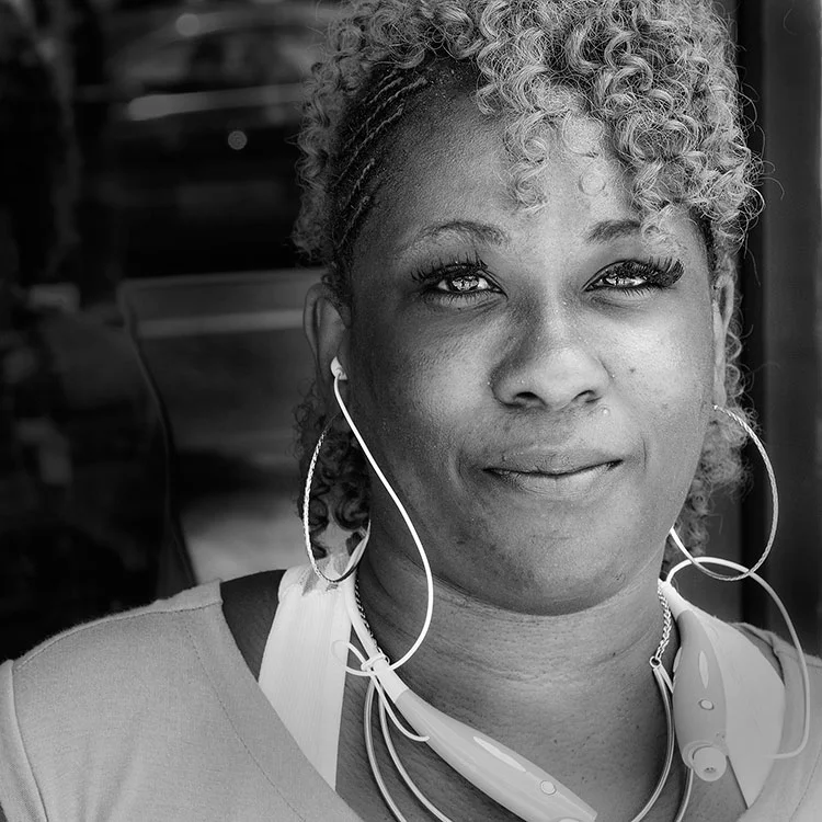 As she emerged, there was the latte in one hand and a pastry in the other. After a brief conversation I asked her to stand in the doorway, which I propped open with my foot as I shot. I asked her to remove the sunglasses, but her hands were occupied; I reached up and removed them. After photographing, I carefully put them back on.